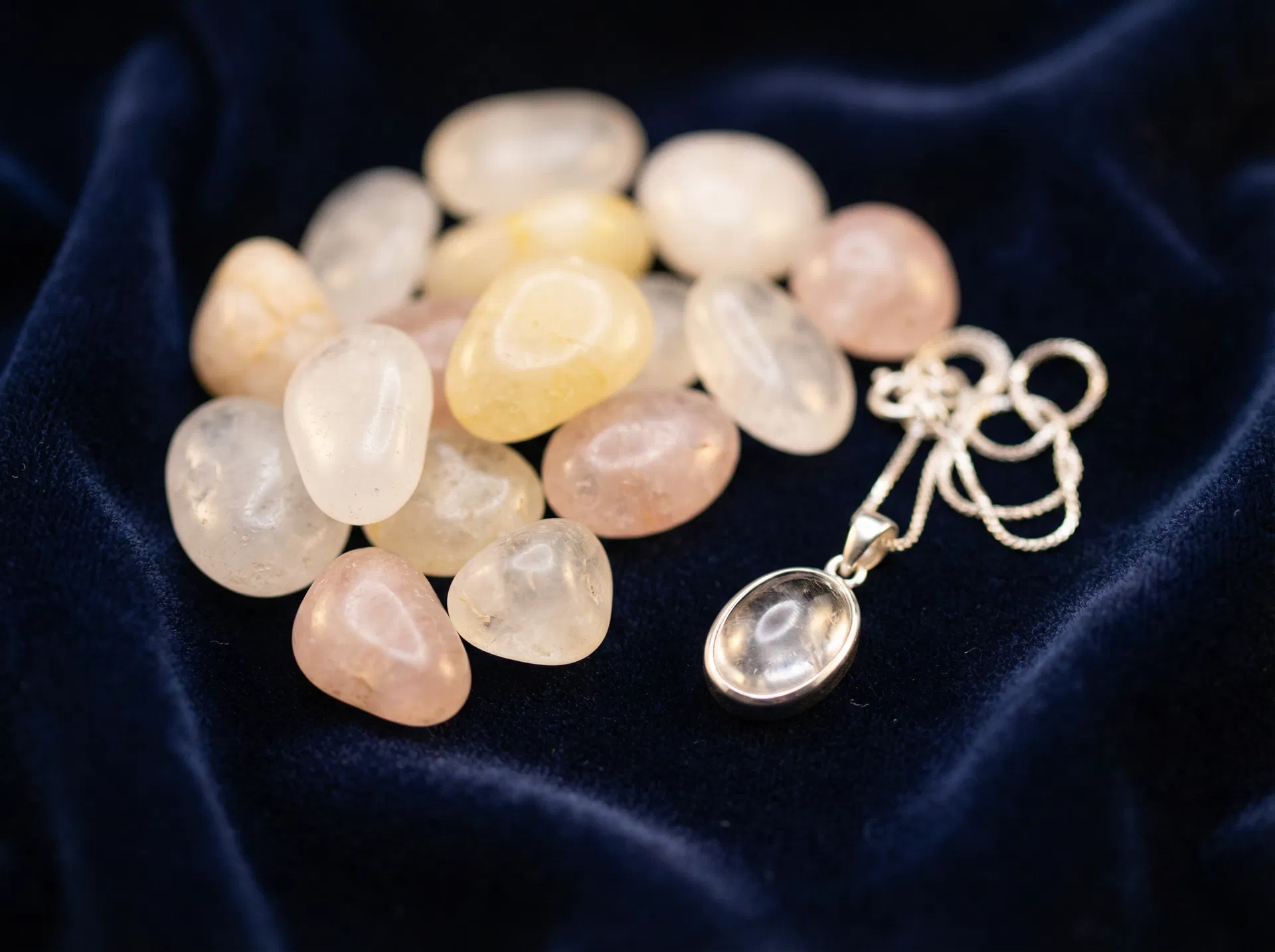 !Polished Cape May Diamonds and silver pendant jewelry displayed on navy velvet